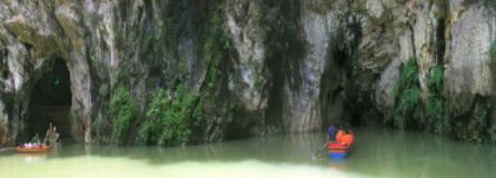 水洞長1000余米,半是人工半天然,登舟入洞,借助稀疏的燈光和導(dǎo)游的手電筒辨認(rèn)著一處一處各各不同的景物,頗有一點(diǎn)神秘之感。洞盡船出,豁然開朗,但見茂竹修篁叢叢簇簇,一泓綠水微波不興,野趣天成,靜謐無聲,此處名“竹林翠溪”,宛如一世外桃源。旱洞共三層,滿布著形態(tài)各異的石鐘乳、石筍、石柱、石幔,其第三層洞廳軒敞,一座天然石橋飛架兩懸崖間,人稱“奈何橋”,橋下即是深不可測的陰潭,景觀之奇特,令人叫絕。旱洞出口處,有苗寨一座,是專為旅游者興建的,游人盡可在此親身體驗(yàn)一次苗家的婚俗。