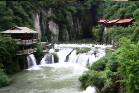 水洞下游有臥龍湖,水清可鑒,湖邊排列著水車、水碾、水磨、“香粑車”等等往時(shí)鄉(xiāng)間常見的農(nóng)家物,給人以既古樸又清新的感覺。與臥龍湖相連的是一處罕見的鈣化灘,足有200米長,灘面上瀑布流瀉,水簾溶洞星羅棋布,植被茂密,堪稱喀斯特景貌的一絕。這一帶,春來桃花爛漫,夏臨蘭草吐芳,金秋野菊盛開,初冬火棘紅艷,一年四季,風(fēng)景如畫。