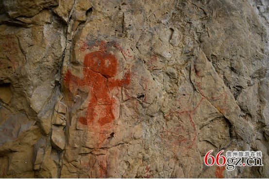 據(jù)資料載,金山洞古代崖畫以赭色涂繪人、馬、狗等等,隱約可見形態(tài)各異的大小圖像二三十個(gè)。人物多作行走狀,亦有雙手高舉者,似乎在祈禱。從其畫風(fēng)觀察,與相距不遠(yuǎn)的省級(jí)文物保護(hù)單位--長(zhǎng)順龍家院崖畫十分相似。