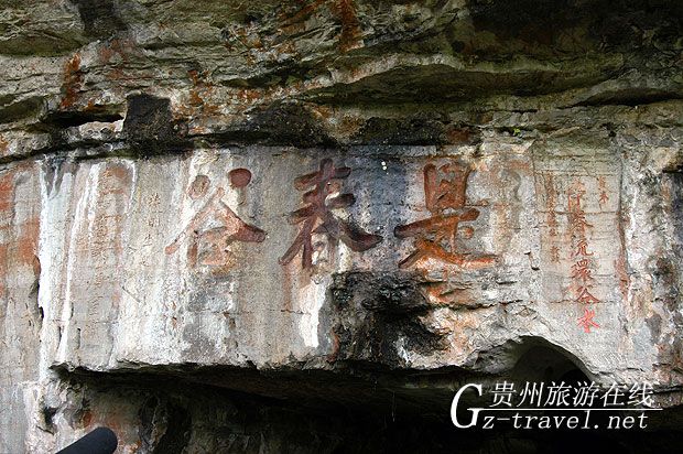 “是春谷”摩崖長(zhǎng)20米,高3米,約2萬(wàn)余字,名為《洗心泉集》,從經(jīng)史集成的詩(shī)章共46首,670佘行。所集之書(shū)包括易、書(shū)、詩(shī)、春秋、三禮、四書(shū)、孝經(jīng)、爾雅、楚辭、漢、魏、晉、劉宋、南齊、北、周、隋、唐、五代、宋、金、遼、元、明以及時(shí)賢黔宦,黔人等各時(shí)代著名書(shū)籍。每字約4,5厘米見(jiàn)方,歐體楷書(shū)工整秀麗,為貴州摩崖上乘之作?!鞍灼r春流環(huán)谷水,青山高詠屬宣城?!庇紊酵嫠g,詠此詩(shī)句,別有韻味。