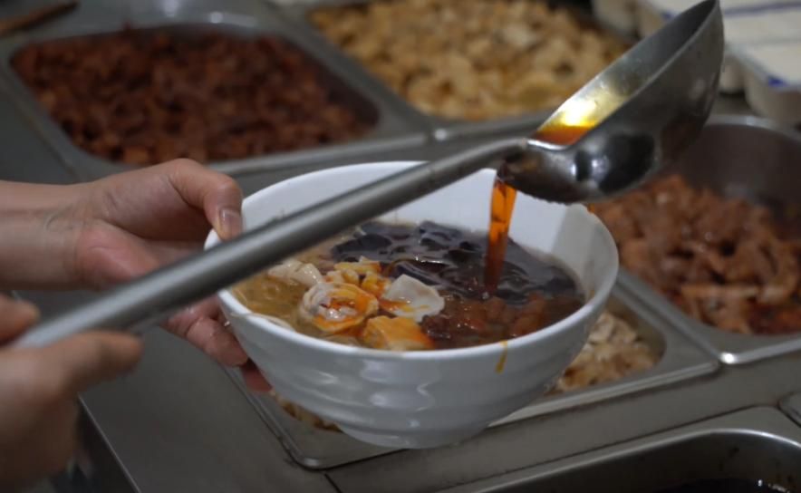 面條,是特制的人工搟制雞蛋面,與廣東云吞面相似,盤成一個(gè)個(gè)面團(tuán),下一碗,丟一個(gè)面團(tuán),方便、準(zhǔn)確又節(jié)省時(shí)間;