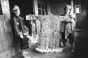 百鳥(niǎo)衣傳承人姜老本(右)在展示自己制作的苗族百鳥(niǎo)衣