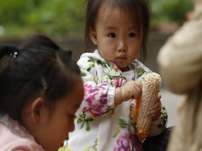 貴州貴陽苗族老年人與兒童剝玉米